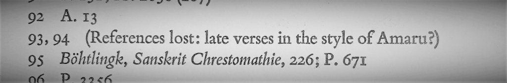 References were not lost for any other verse. I began to suspect I was being played. My first instinct was to think of the Homeric connection implied by the similarity of the name Amaru to that of Homer. Further, both of these “authors” are merely names attributed to works. Indeed, Brough explains as much in his Introduction: “The appearance of the name Amaru, for example, simply means that the verse in question occurs in one of the recensions of the Amaru collection, or, if it does not so occur, that it is attributed to Amaru by an anthologist” (p. 17).